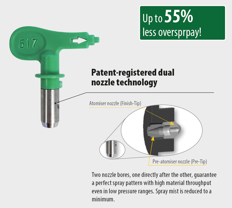 The new WAGNER HEA ProTip Airless nozzle achieves perfect surface results with up to 55% less overspray at reduced spray pressure