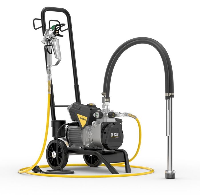 Equipped with High Efficiency Airless (HEA) technology, the Wagner SuperFinish 23 Pro reduces spray mist by up to 55%, offering maximum control while maintaining a high-quality finish. This makes it ideal for detailed work where precision is key, ensuring fewer touch-ups and smoother results. - Flexible Suction Hose for Direct Material Use