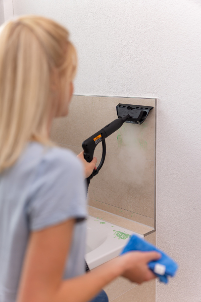 With a WAGNER steam cleaner like the Power Steamer 915 E, you can clean surfaces thoroughly and hygienically—without harsh cleaning agents. Hot steam dissolves even stubborn dirt, grease, limescale, and bacteria on tiles, glass, fixtures, kitchen surfaces, upholstery, and much more.